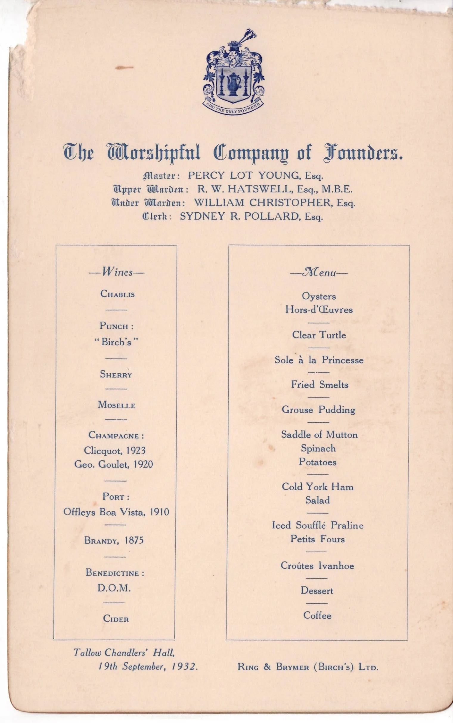From the Archive: A Founders’ Dinner at Tallow Chandlers’ Hall, 1932